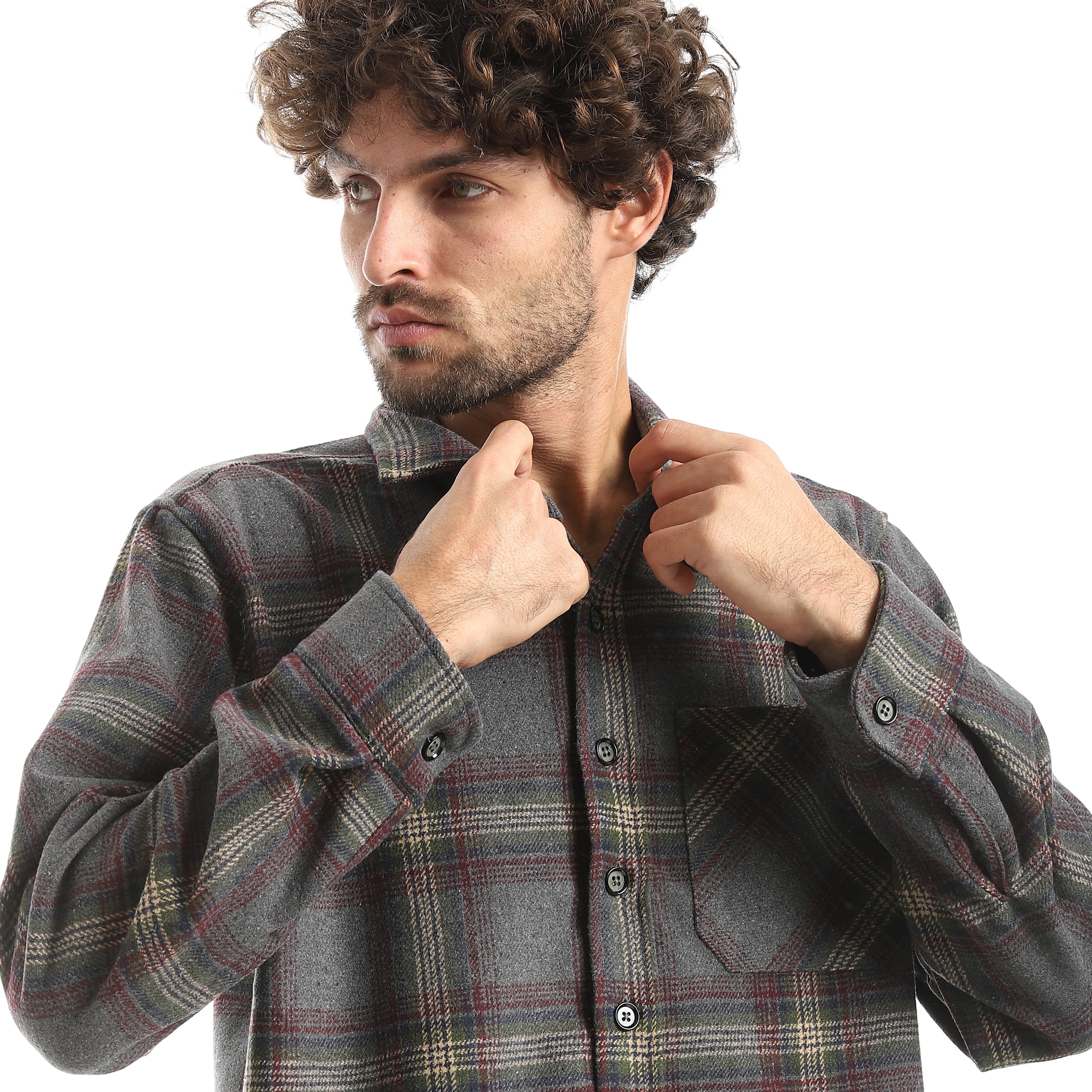 قميص اكتف رجالي كاروه بكم 1جيب - رمادي*ابيض
