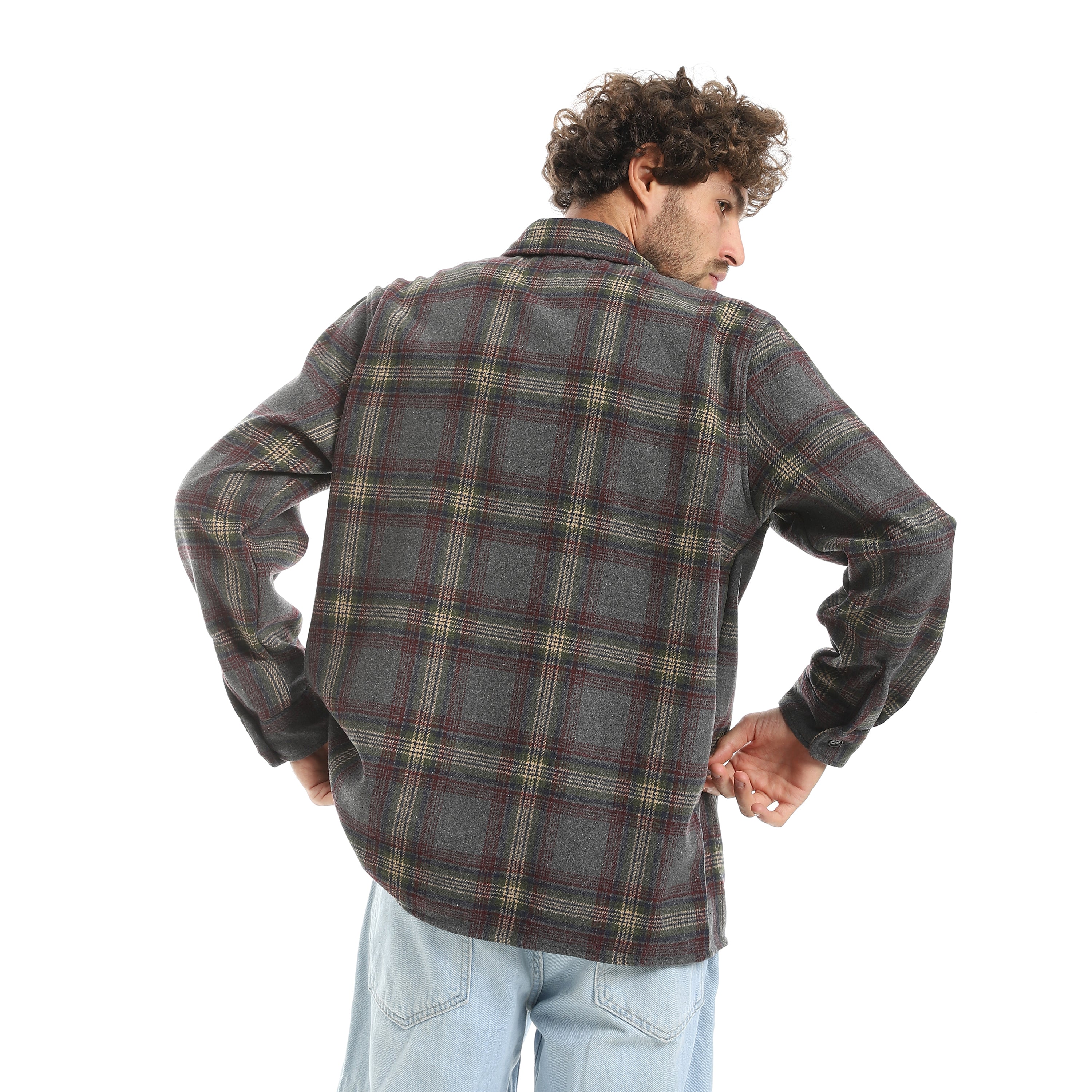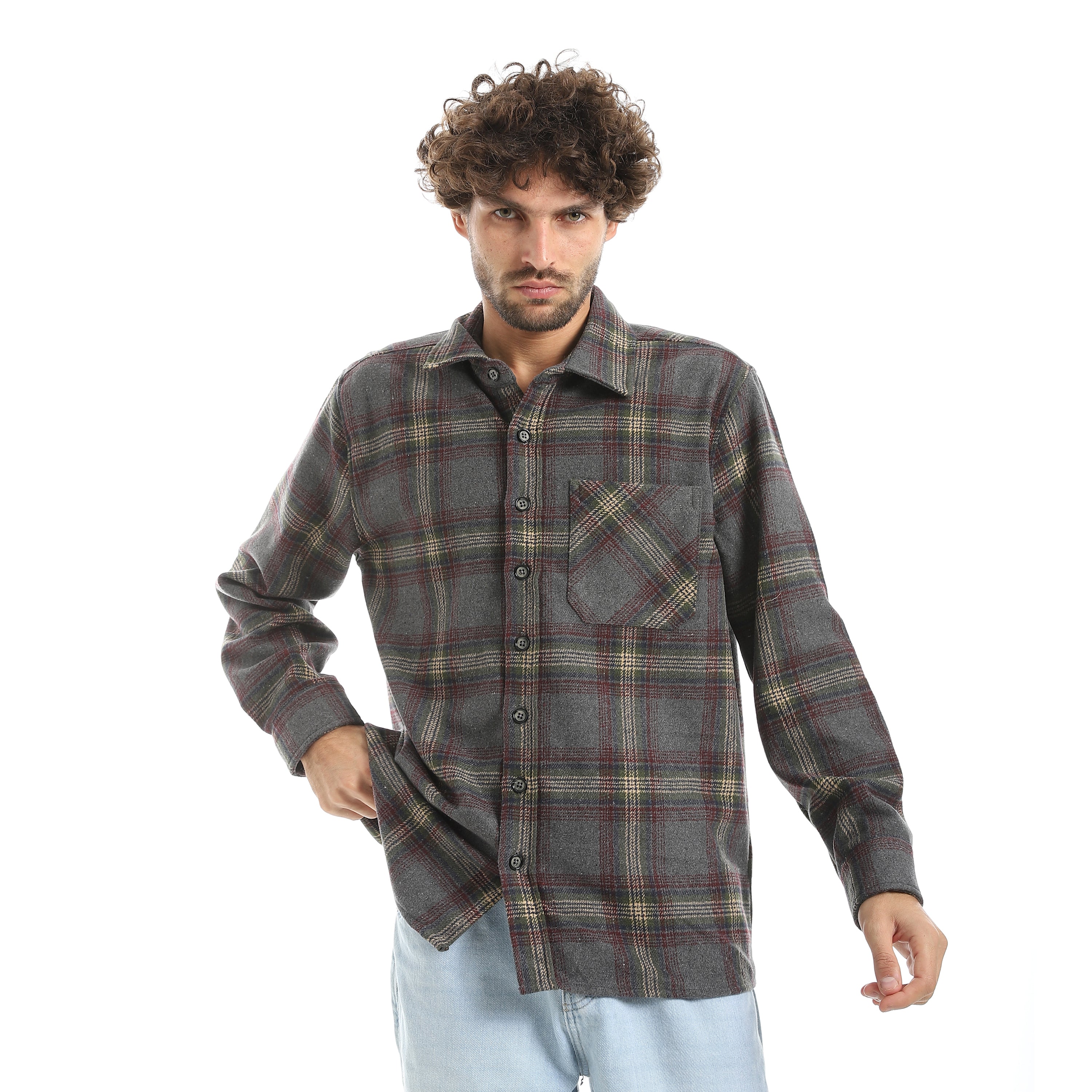 قميص اكتف رجالي كاروه بكم 1جيب - رمادي*زيتي